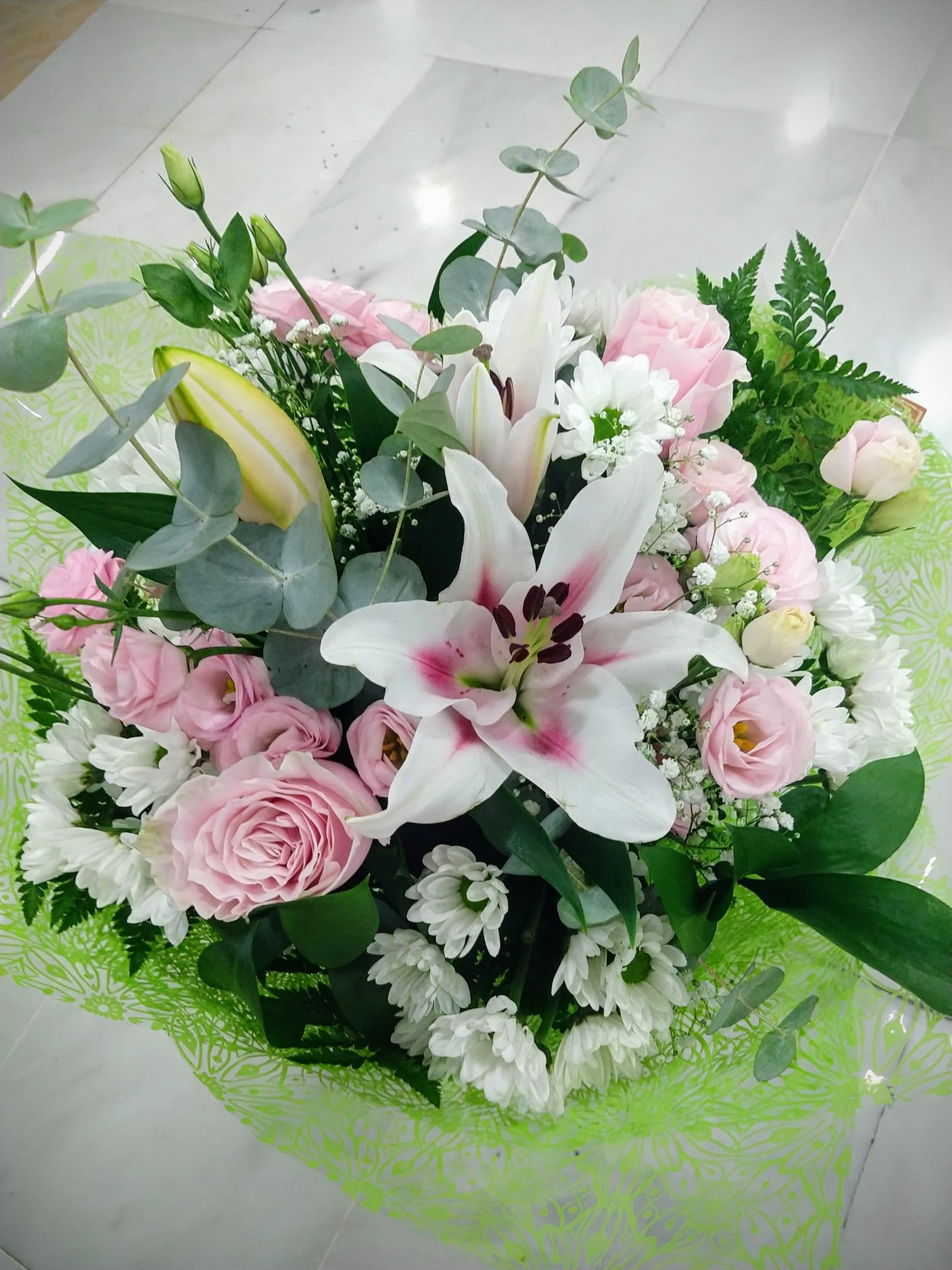- Lilium Blanco Oriental 🤍🩷: Majestuosos lirios blancos con detalles rosados en el centro, que aportan elegancia, sofisticación y un aroma dulce y embriagador. Su presencia imponente los convierte en una de las flores protagonistas.