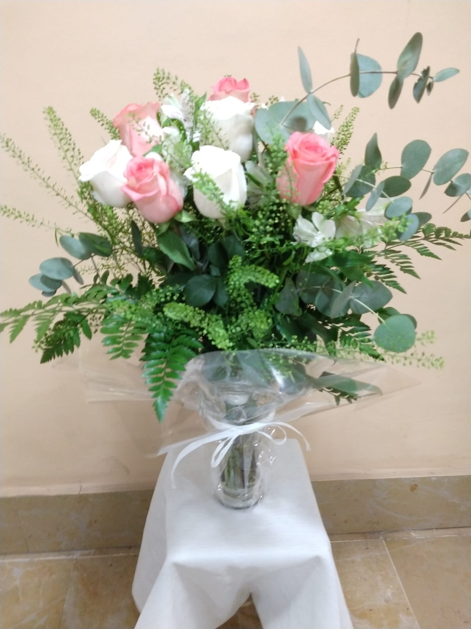 Un diseño donde la pureza del blanco y la calidez del rosa se entrelazan en una composición equilibrada y llena de armonía. Este ramo de rosas blancas y rosadas es el detalle perfecto para transmitir dulzura, gratitud y admiración con un gesto sencillo pero significativo.