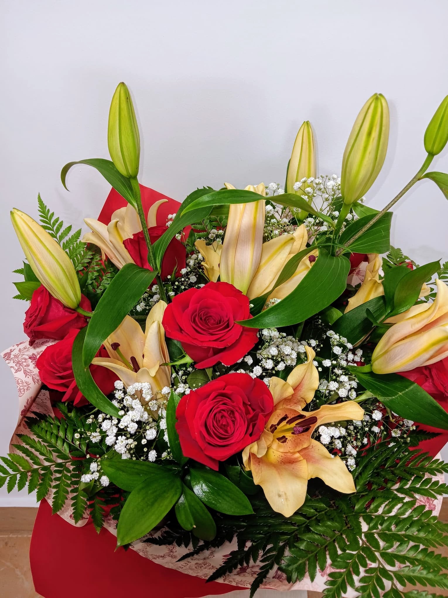 Este ramo de rosas y lirios de Holanda fusiona la intensidad del rojo con la elegancia sutil de los lirios, creando un diseño que transmite pasión y sofisticación. Un detalle perfecto para quienes aprecian la belleza en su máxima expresión.