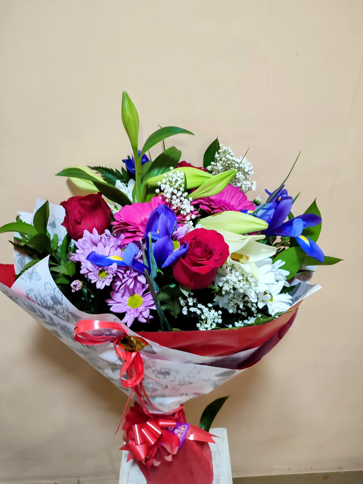 🌸 Ramo Primaveral de Rosas Rojas e Iris – Una Explosión de Color y Sentimiento